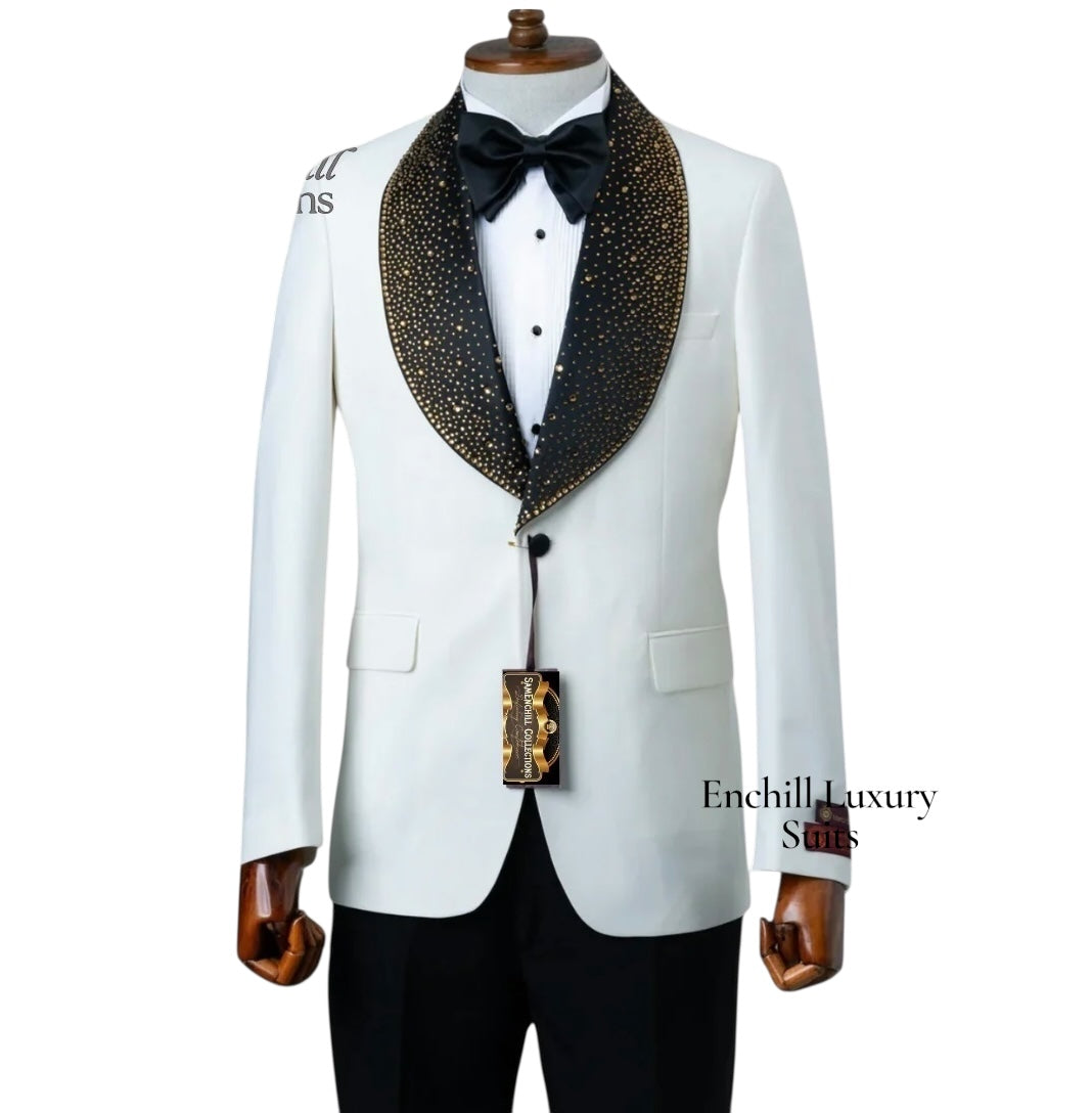 The gold and black carefully arranged pearl lapel brings class and beauty to this suit.
